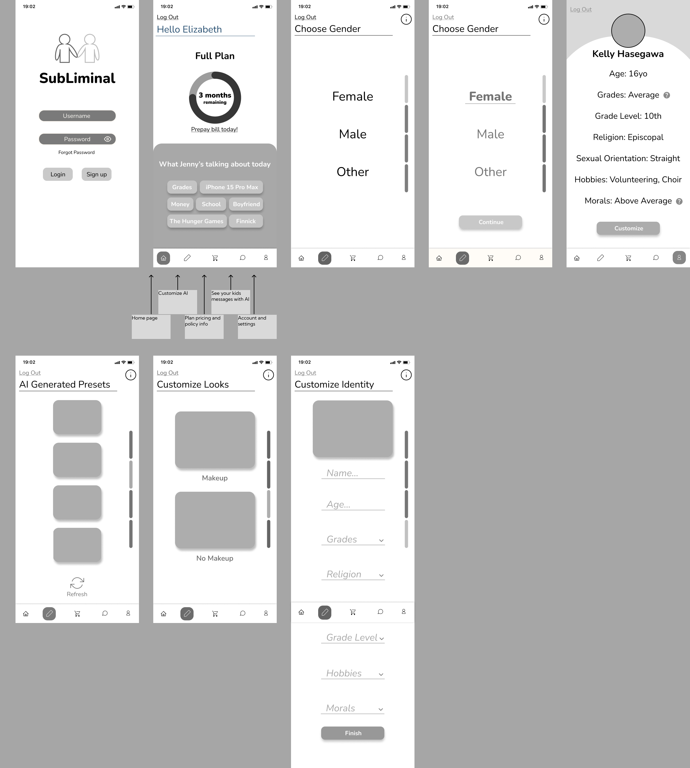 These are the frames for the SubLiminal interactive prototype. This also shows notes I made to explain what each menu bar icon would be. I created the avatars in The Sims 4.