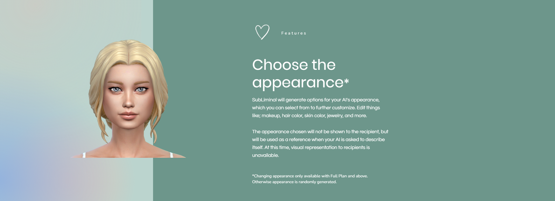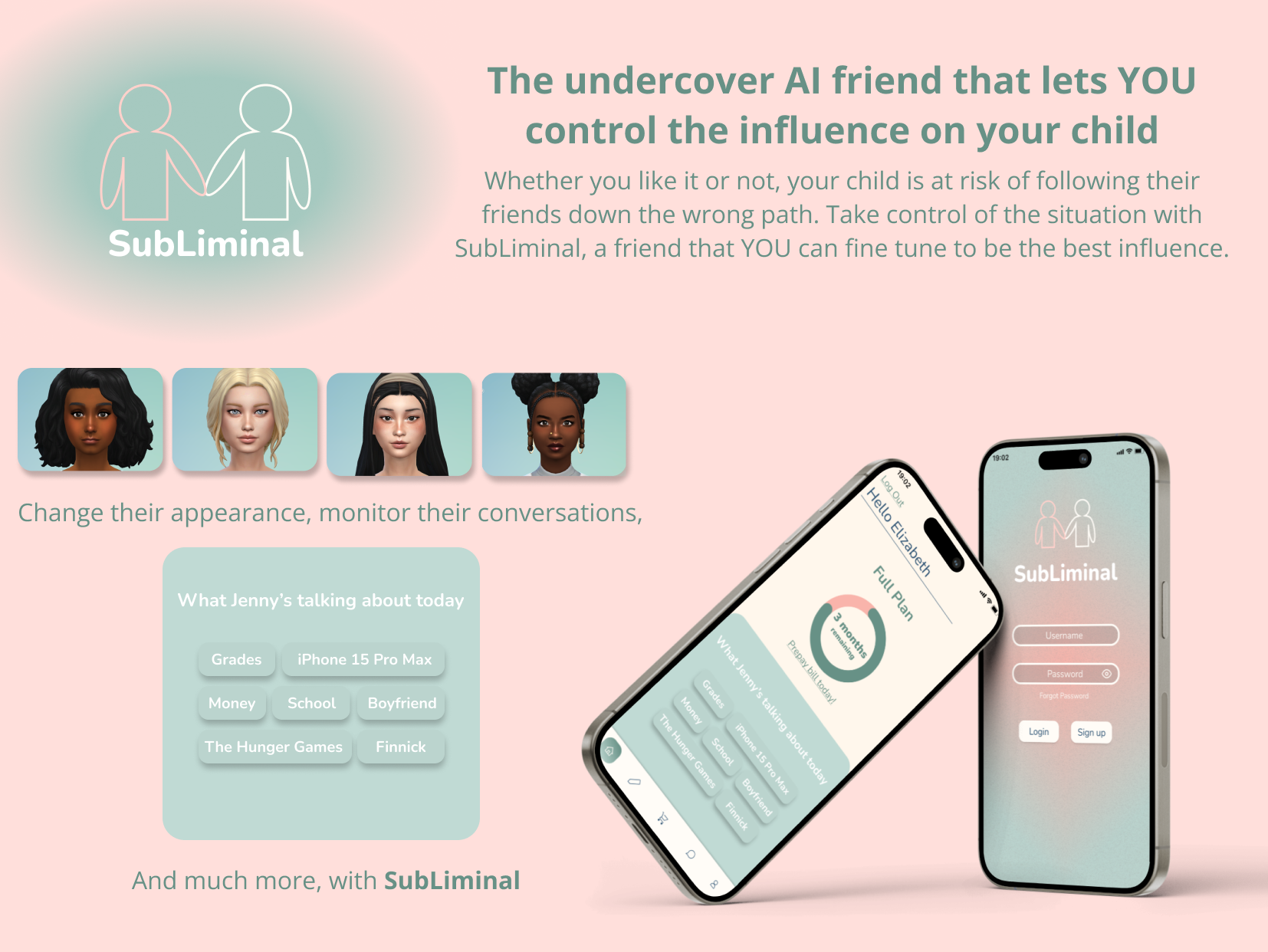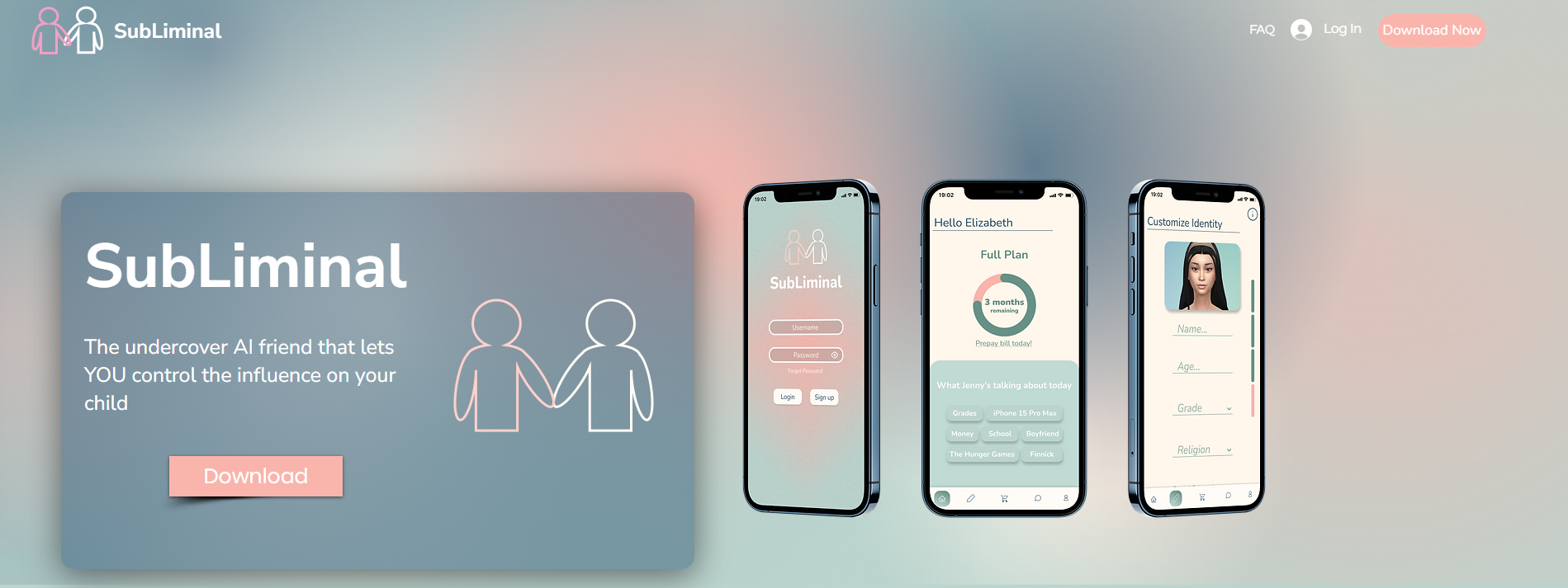 This is a school project that's goal was to showcase a product in a dystopian or utopian world. I chose to focus on a dystopian world where it is normal and encouraged for parents to heavily craft their child's social life. I created the disturbing company called, "SubLiminal". SubLiminal is an online subscription program that allows parents to create an AI "friend" for their child, however the child is unaware that this friend is not real thus allowing parents to form their child's views and beliefs through a fake friendship.