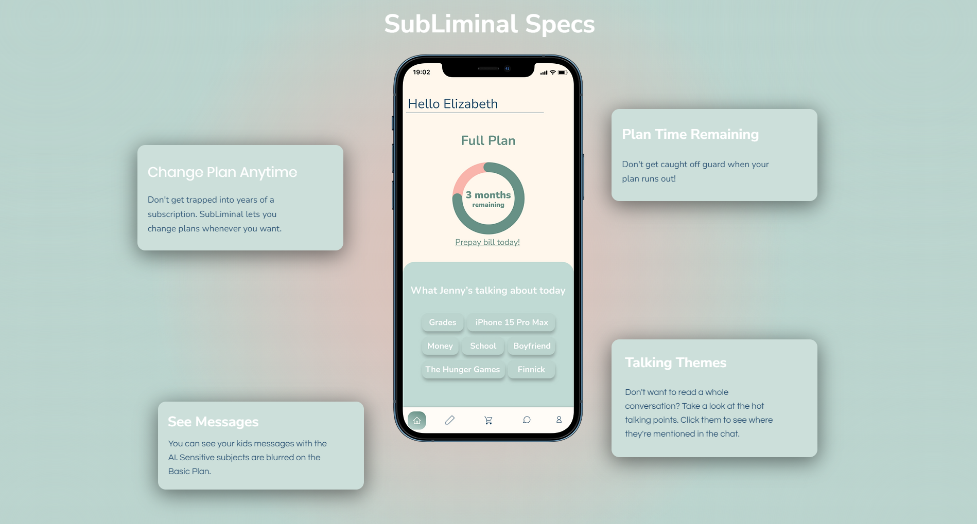 This is the Logo for SubLiminal, made in Adobe Illustrator. I wanted to signify the user holding hands with their AI “friend”. The title references the subliminal messages that parents are instilling on their kids with the app.